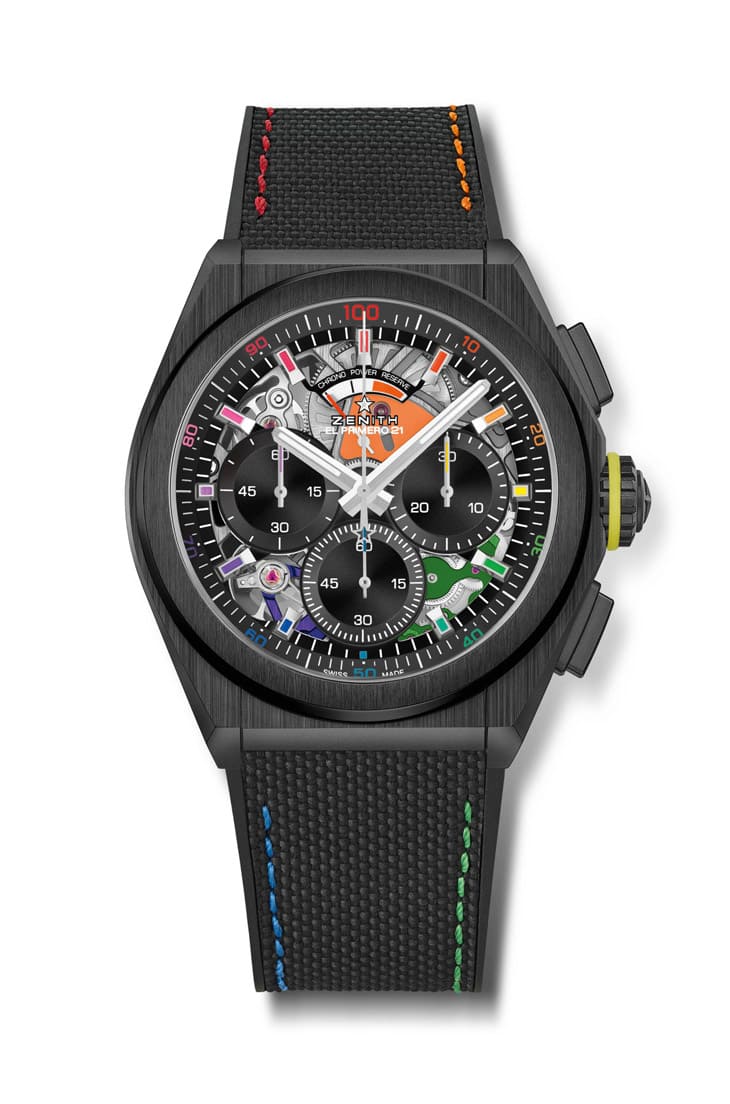 若要从ZENITH当代系列中挑一款最具视觉冲击力的作品,DEFY 21 Chroma II 绝对名列前茅。此款作品以黑色微喷砂陶瓷打造44mm表壳,雾面质感让机芯与色彩元素更显突出,表冠上的黄色橡胶饰环形成点亮整体的细节,让这款前卫时计在低调黑色基底上展现活力跳跃的性格。