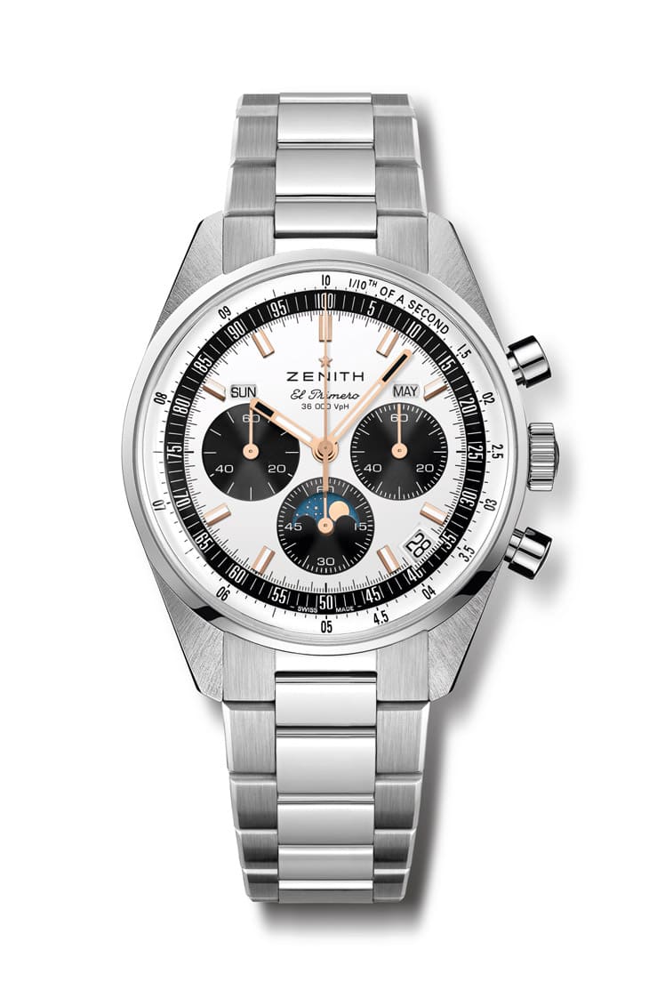 Chronomaster Original全日历月相计时码表是真力时对历史美学的当代诠释,其38mm不锈钢表壳严格依循1969 年经典型号A386的原始比例打造,从线条、表耳到泵式按把都流露出浓厚复古气息,此款採用银白蛋白石「熊猫」面盘,搭配黑色计时盘与1/10秒刻度轨道,视觉层次清楚,并带有三眼布局的经典韵味,加上玫瑰金指针与时标点缀其间,使复古造型多了现代高级感。