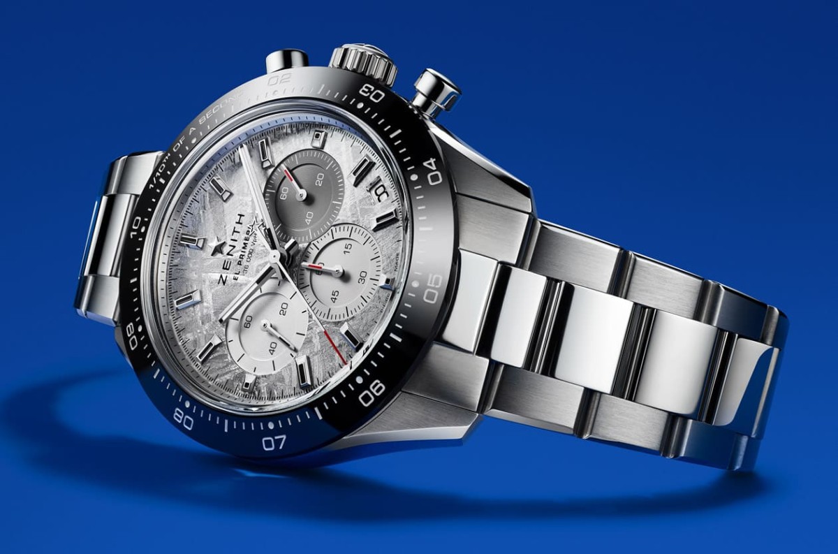 Chronomaster Sport是近年最具人气的真力时代表作,而陨石面盘版本让这款高震频运动计时进一步提升收藏价值。41mm不锈钢表壳透过拉丝与拋光交错处理,展现乾净俐落的运动质感;固定式黑色陶瓷表圈刻有1/10秒刻度,是此系列的重要象徵,与高震频机芯的速度节奏完美呼应。
