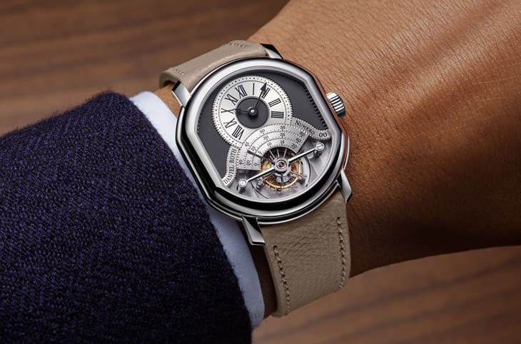 Tourbillon Platinum延续了1988年由创办人亲自构思的双椭圆形表壳,这个造型同时运用了方形与圆形元素,让陀飞轮的存在变得更加戏剧、更加集中视线,也是近代高级制表设计中少见的经典案例。然而,新作并未原封不动地复刻原版,而是在比例与细节上做了巧妙修订,手工焊接的表耳保留其辨识度,但线条更滑顺,使佩戴时更贴手;而 DR001机芯的配置让表壳整体更显俐落。值得玩味的是,那枚沿表壳内缘滑动的长秒针依旧存在,看似低调,却是老收藏家一眼就能认出的传承符码。