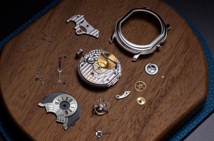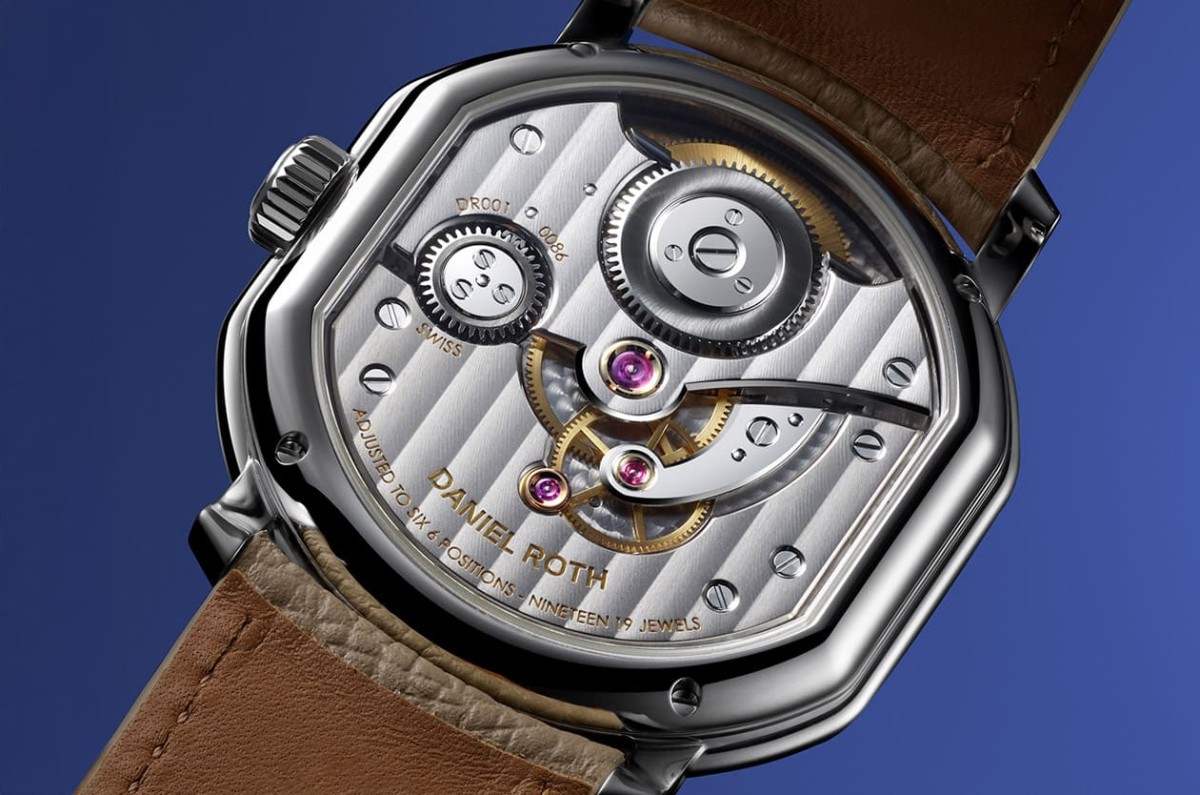 驱动此作的是DR001手上链机芯,由制表大师Michel Navas与Enrico Barbasini主导开发,两人过去曾打造无数陀飞轮作品,这次以DANIEL ROTH的历史为蓝本,将技术与美学融为一体。DR001的动力储存提升至80小时,结构配置也变得更平衡、更适合双椭圆形表壳,其206枚零件皆以传统方式手工修饰,包括黑化拋光、圆滑倒角、鱼鳞纹与极细日内瓦波纹。透过透明底盖,可以看到整个机芯像舞台般分层、呼应面盘纹理,视觉一致性非常强烈,也让机芯本身像独立作品般具有欣赏价值。