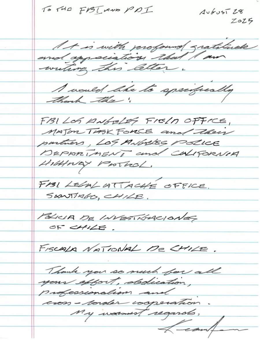 但让人格外注意的,不只是失窃手表本身,而是基努在物品找回后所做的一件事:亲笔写信。这年代很多明星公关声明都是印刷体、电子档,他却选择用手写,把感谢一笔一画写给参与追查的单位,从洛杉磯警察局、FBI,到远在智利圣地牙哥的PDI(智利调查警察局)与检察院等,甚至连协助协调的加州公路巡警都没漏掉。