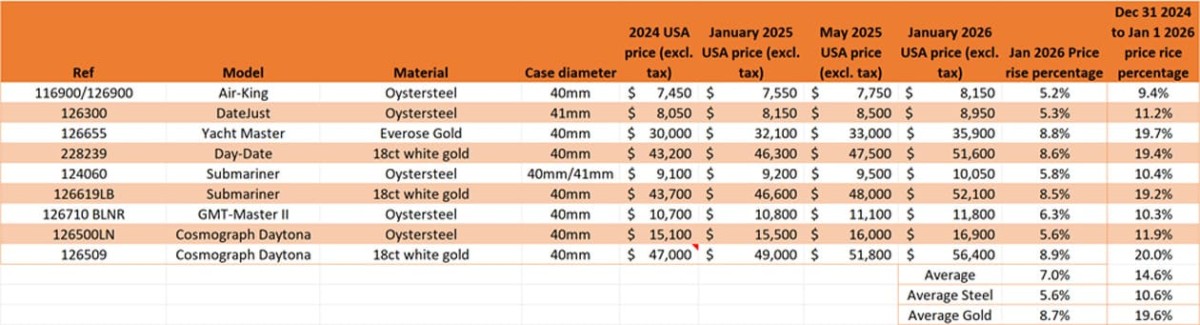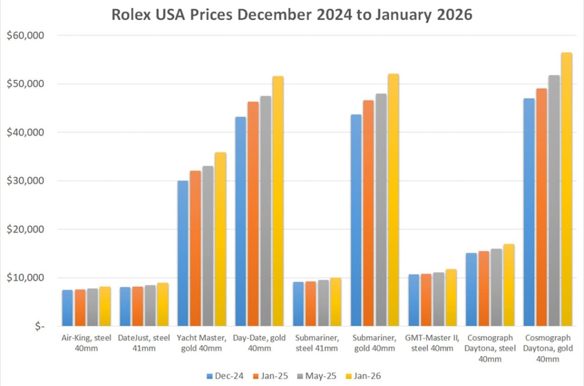 ▲劳力士爆款从2024年底到2026年1月的定价调整变化图。Source:WatchPro