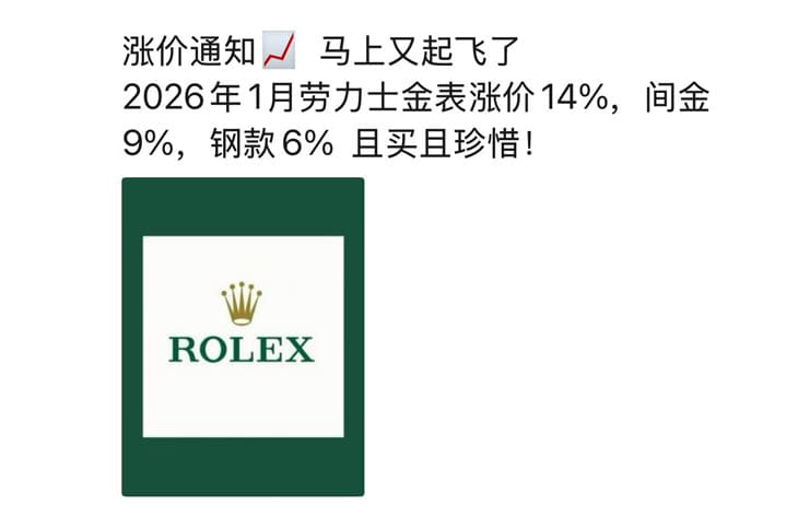 把视线转向亚洲,中国大陆市场虽然尚未有官方文件释出,但表友间已流传一份涨价预告,引发广泛讨论。传闻指出,2026年初中国市场的调整幅度可能比美国更为激进,全金款上看14%、半金约9%,钢表则在6%左右,即便这些数字仍待证实,但从结构来看,与美国市场的方向高度一致,贵金属承压最重,钢表则相对克制。