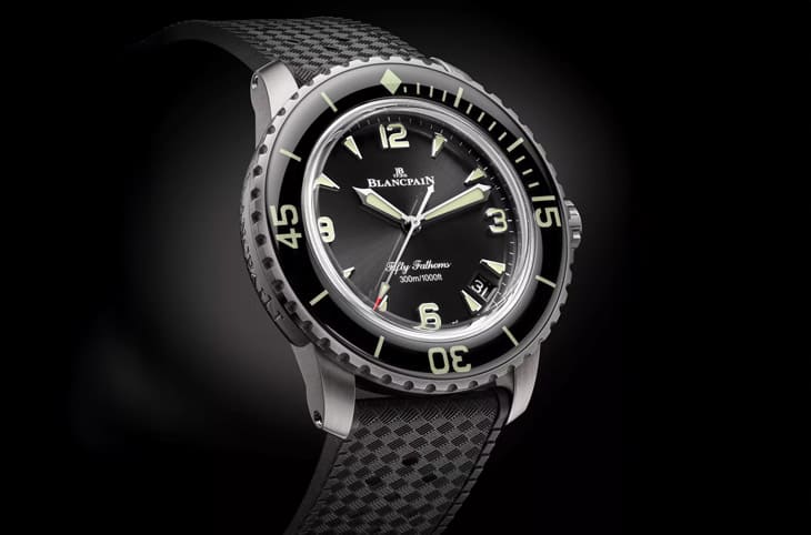 ▲宝珀Fifty Fathoms五十噚钛金属表壳轻量耐操,拥有5日动力、300米防水,诠释内敛却懂门道的硬派品味。