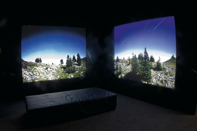 ▲ 「好奇心」小屋展示了一系列,霍兹沃斯(Dan Holdsworth)拍摄的汝拉山谷照片,旁边摆放着爱彼闻名遐邇的皇家橡树精钢手表。