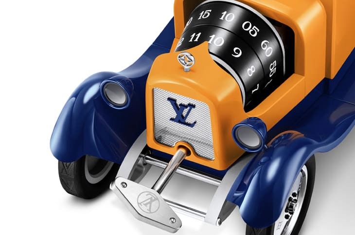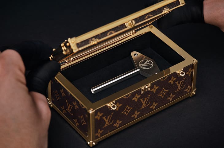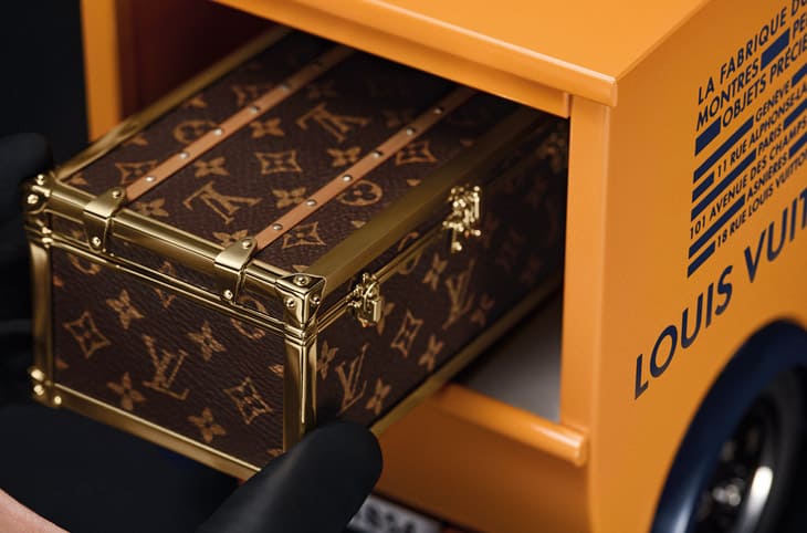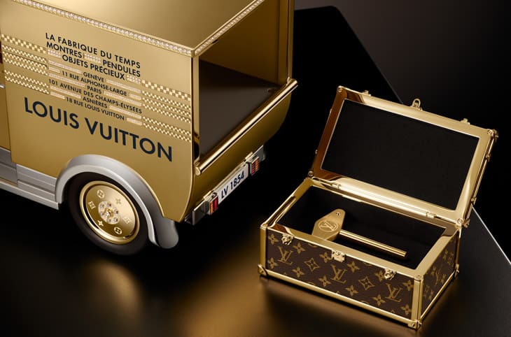 用家与座钟互动方式同样延续「旅行的艺术」主题,在货车尾部的行李厢中,放置一只按比例缩小的Monogram迷你行李箱,打开后,会发现一把造型取自经典行李箱金属包角的专属钥匙,使用者需将钥匙插入座钟,以类似老式汽车手摇启动的方式进行上链或调校时间,这个动作并非单纯的功能操作,而是一场充满仪式感的参与方式。