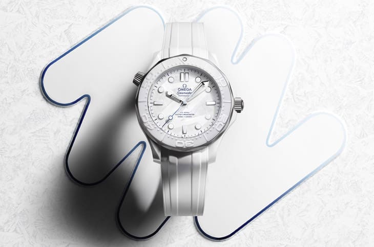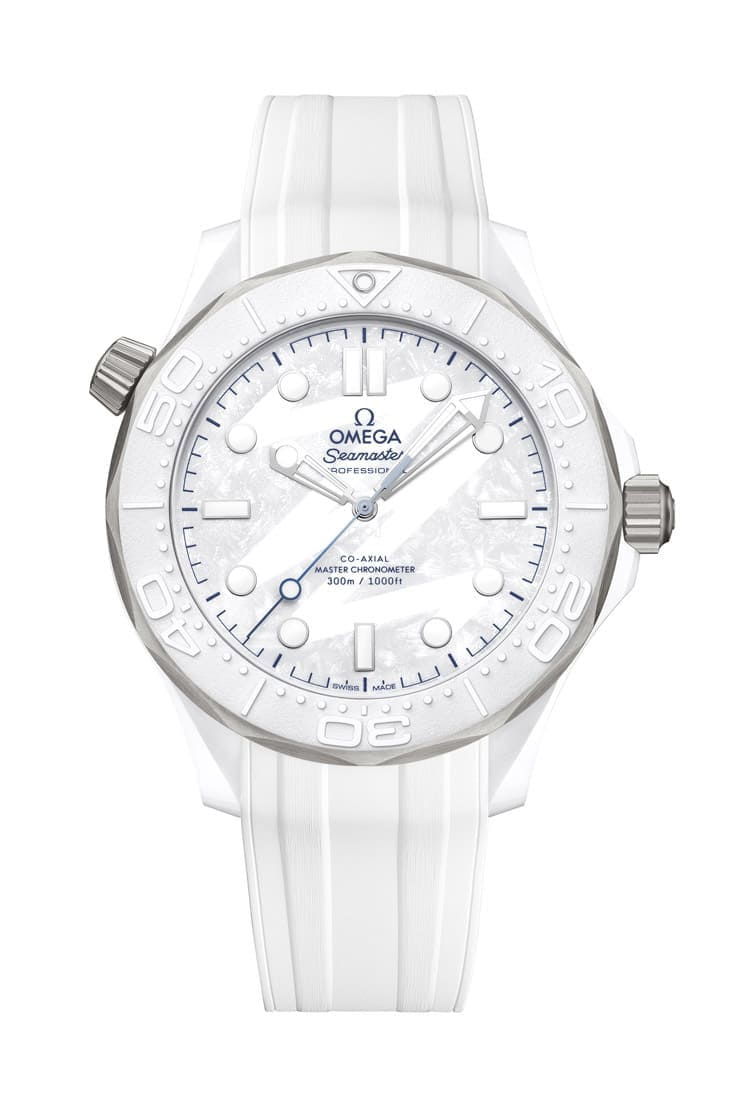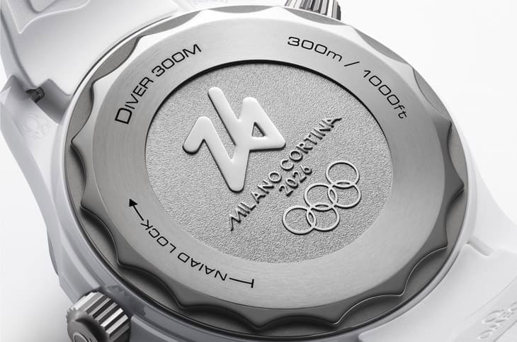 距冬奥开幕仅两周的2026年1月,欧米茄发布第三款作品——海马潜水300米Milano Cortina 2026特别版,表迷暱称「雪白海马」,43.5mm表壳以白色陶瓷打造,表圈、表冠与排氦阀则採五级钛金属,异材质组合增添科技感并减轻重量。