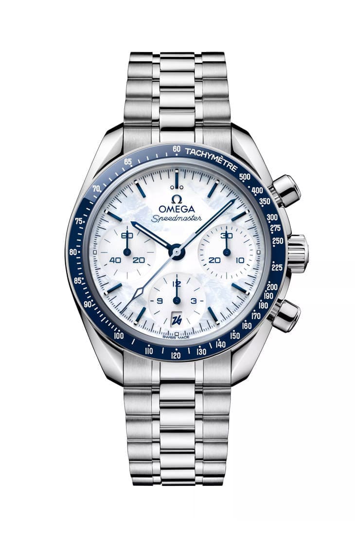 特别之处在于面盘细节:白色亮漆底层覆以浅蓝色磨砂涂层,呈现如冰霜般的纹理;三枚小表盘採同心圆纹饰,模拟滑雪坡道,6点方向日期窗中的"26"日数字採深蓝色"Milano Cortina 2026"的字体设计,低调却充满惊喜,它的表圈以蓝色陶瓷搭配白色珐琅测速刻度,延续登月表Box式镜面风格,内部配置3330自动上链机芯,有导柱轮与同轴擒纵,并经过COSC认证加持,精准可靠。