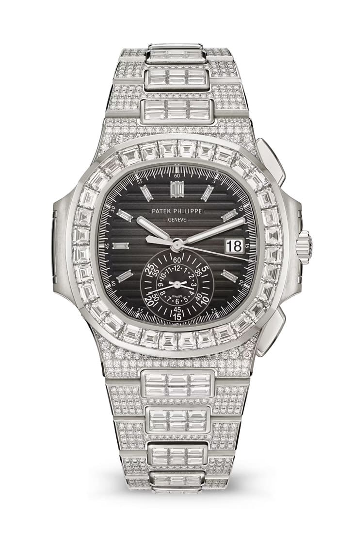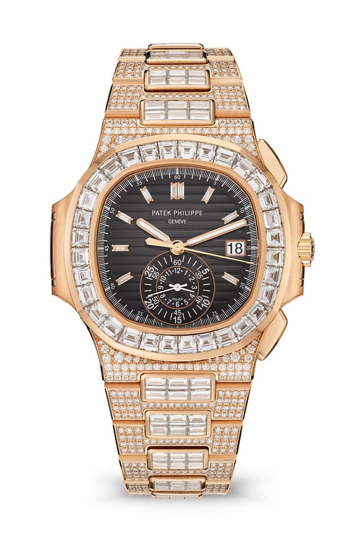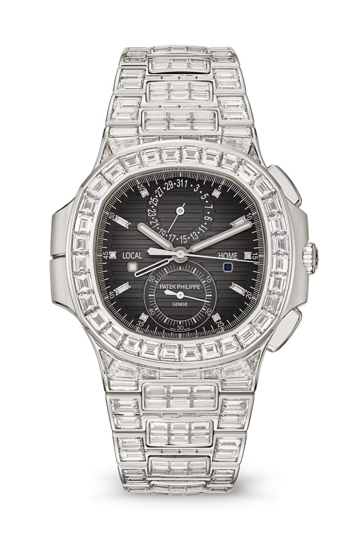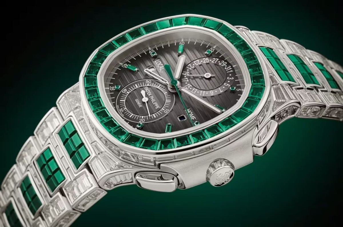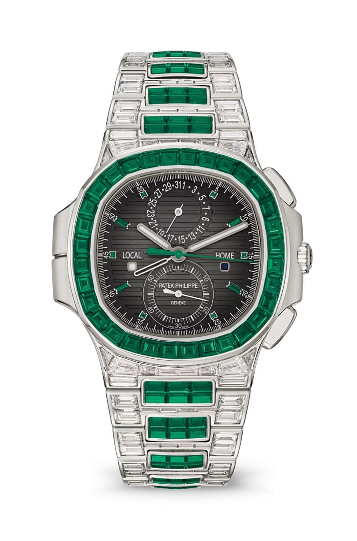 真正把奢华推到极限的,还是Nautilus Ref. 5990,它具备两地时间、日期加计时功能,再搭配整只表400多颗长方形切割钻石,宝石总重超过33克拉,这已经不是手表,而是会走时的珠宝艺术品,但是价格自然毫不客气,全钻款约 5,300台币,彩色宝石版本突破6,000万台币,祖母绿款甚至超过8,300万台币。
