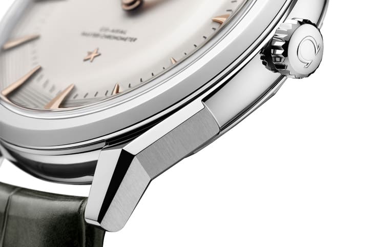 而真正让人一眼着迷的,是那组重新登场的「狗腿表耳」,带有拋光倒角的立体线条,搭配外侧垂直拉丝处理,在光影之间展现出极具层次的细节,这种设计,正是黄金年代欧米茄的精髓所在。