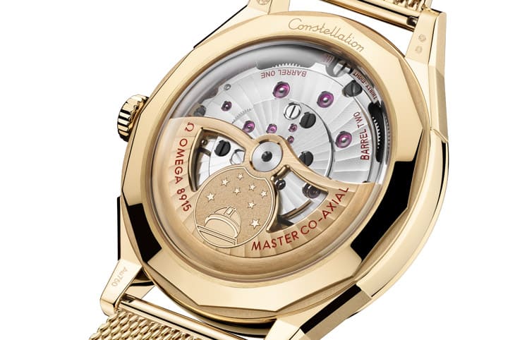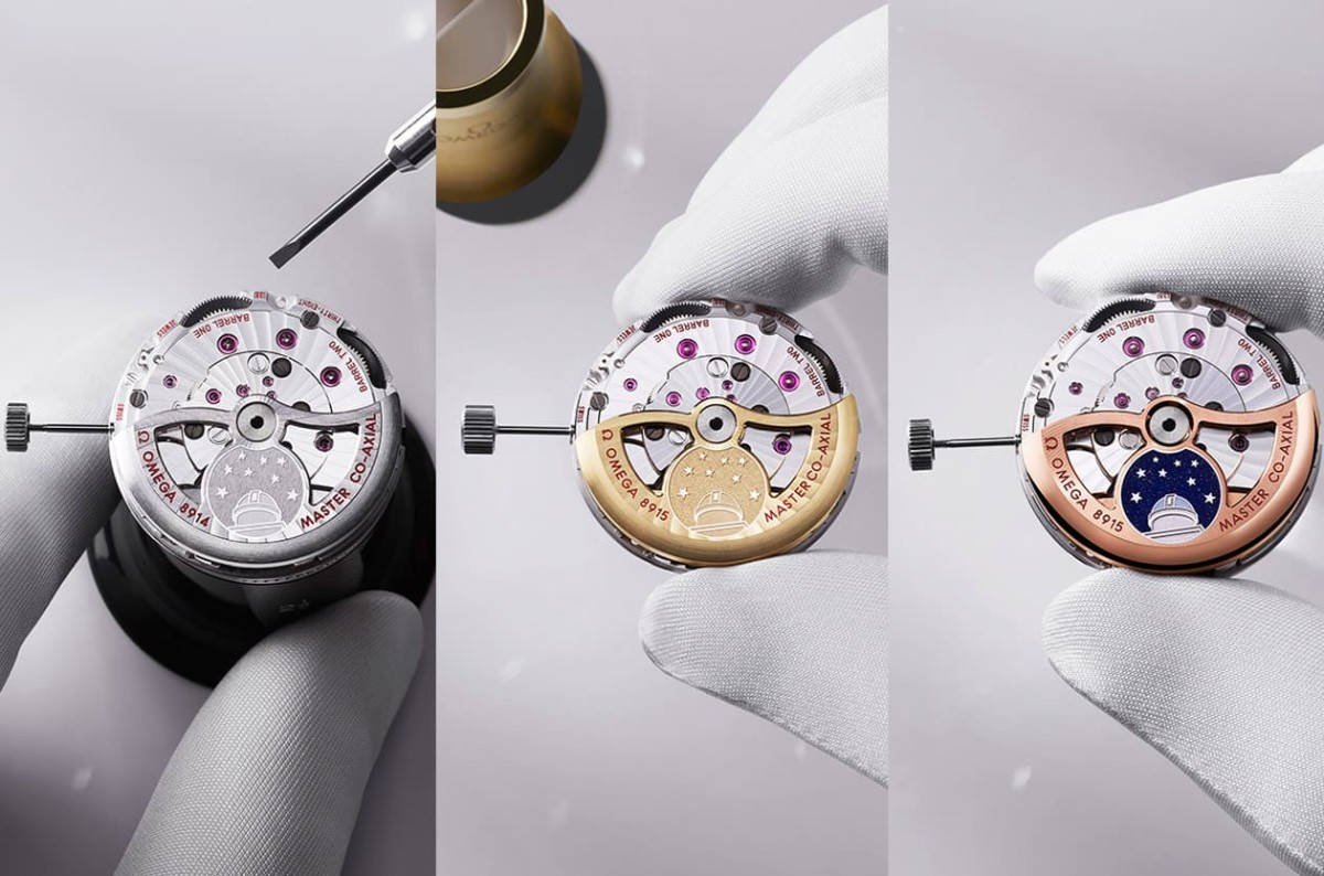 欧米茄也很有意思地把机芯装饰分成三个等级,例如Standard(标准级)採用镀銠处理、简洁俐落,而Luxe(奢华级)则採用Moonshine金自动盘与桥板,搭配阿拉伯式日内瓦波纹,还有结合Sedna金底座、白金天文台徽章与砂金石玻璃珐琅的Grand Luxe(顶级)。其中Grand Luxe版本上那枚带有星空效果的天文台徽章,几乎已经超越「机芯装饰」的范畴,更像是一件微型艺术品。