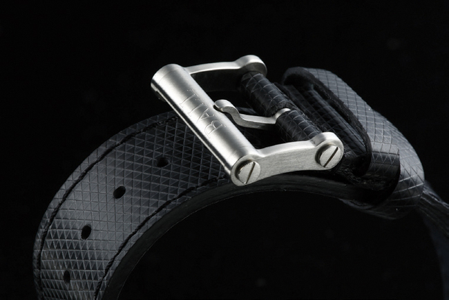 针扣的造型颇有工业感,logo的打法也很别致。表带是皮带外覆橡胶,胶带上有叁角形的压纹;橡胶表带虽多,却很少有像这款那麼有个性的,以整体风格来说应该更适合BMW的M系列。
