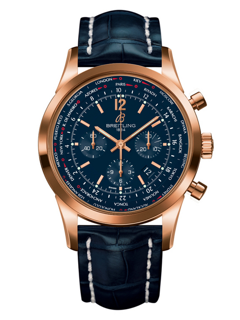 欲搏击长空,掌控时间,唯有性能卓越的飞行时计才能担负使命。百年灵越洋世界时间飞行员计时手表(Transocean Unitime Pilot)搭载高性能百年灵自制05机芯,融合超级实用的世界时区系统和新颖精密的技术型外观,与百年灵为飞行员制表的伟大传统交相辉映。得益于全表冠控制的世界时区功能,佩戴者只需轻鬆拉出表冠,向前或向后旋转,时针、城市圆盘、24小时圆盘和日历随即一同自动调整。无论你是驾驶舱的飞行员还是座舱的乘客,如此性能非凡的自动上弦计时手表,无疑是你玩转全球时区的最佳拍档。这款非凡时计採用18K红金材质,搭配独特的深蓝色鱷鱼皮表带,与深邃迷人的幽蓝表盘相互映衬,硬朗之下更添奢华神秘之感。佩于腕间宛如歷经时光洗礼淬炼的老友,睿智冷峻,伴君尽享鎏金岁月。