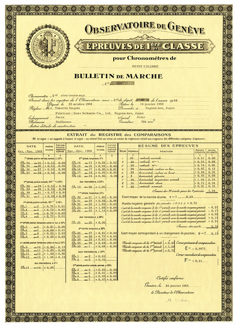 六○年代天文台竞赛盛行,SEIKO不仅是第一个瑞士以外的参赛国家,更在1968年夺得了佳绩。图为该年Suwa Seikosha(諏访精工舍)参赛日内瓦天文台竞赛的检测成绩状。