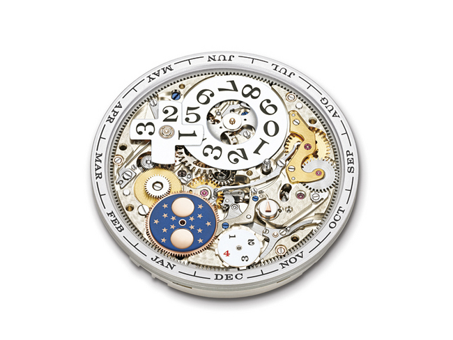 在独特的朗格大日历显示(此装置更是首见于Richard Lange手表系列)下方,左右两侧分别设有星期和月份显示的小型视窗。此排列方式使日历显示一目了然。万年历装置经机械程式设定,可正确显示全年以至闰年各个月份的不同天数,直至2100年前无需作出调校。闰年显示设于分鐘圈数字「15」右侧的小圆窗内。所有日历显示均可瞬间推进,确保各项显示在任何时候都清晰无误。为确保在切换过程中所需的力量减至最低,能量会通过凸轮的转动而逐渐储存,然后在午夜瞬间释放。