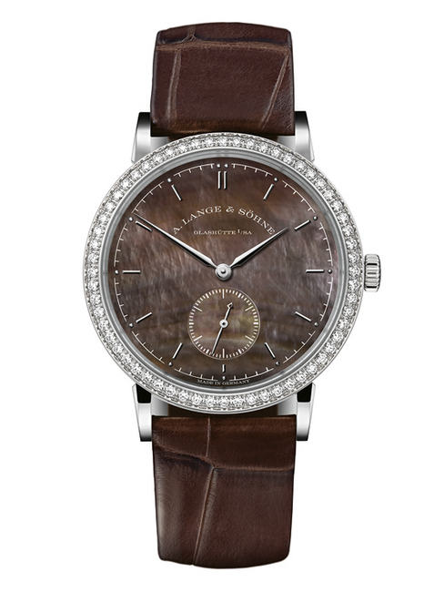 Saxonia系列所有表款的饰面均揭示出其内在的丰富世界。各枚手表皆完美体现出精确的机械技术、优秀绝伦的工艺和平衡有致的设计。而这于两枚全新Saxonia白色(型号878.029)和棕色(型号878.038)表款上亦可见一斑。此两枚迷人的朗格女装手表把设计重点展露无遗。以18K黄金镀銠制成的修长指针和棒形小时刻度,在镶嵌白色或棕色珍珠母贝的闪烁表面上,清楚呈现出小时、分鐘及小秒盘显示。设于6点鐘位置的小表盘与12点鐘位置下方的朗格签署相互融合。色泽亮丽的18K白色黄金,突显出双层表壳的优美轮廓,以至60颗圆钻所散发的闪烁光芒。白色或棕色鱷鱼皮表带与表盘色调相互调和,尽展手表的非凡魅力。