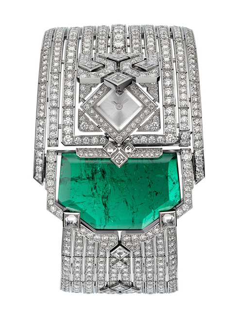 深邃的祖母绿饱含葱翠,浓郁而醇厚。手表若隐若现,装饰艺术风格的钻石线条熠熠生辉,凸显了置于钻石褶皱中的精巧表盘。