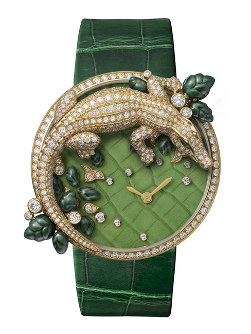 18K黄金表壳,绿色鱷鱼鳞片珐琅彩绘表盘。18K黄金胸针,镶嵌明亮式切割圆钻,珐琅彩绘叶片,祖母绿眼睛。绿色鱷鱼皮表带。石英机芯。编号限量发售50枚。