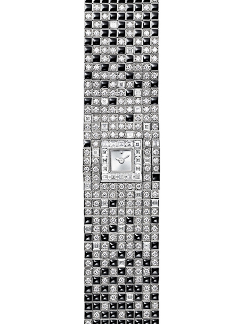 18K镀銠白金表壳,镶嵌明亮式切割圆钻,黑色珐琅。18K镀銠白金表链,镶嵌明亮式切割圆钻。8971 MC型手动上链机械机芯。