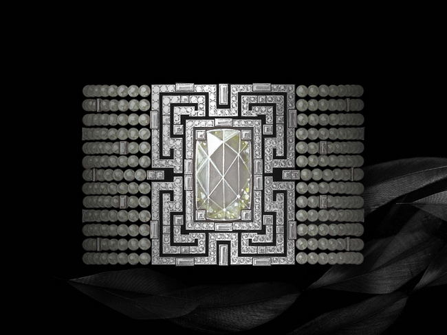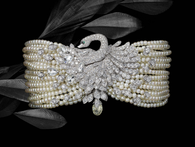 玫瑰式切割美钻绽放令人目炫的火焰。位于作品中央的完美几何造型吸引眾人目光,仿佛装饰艺术时代优雅风格的一声迴响,犹如迷宫般精密盘错。搭配精致闪亮珍珠的腕饰如一道光,超越一切外在表象,穿梭于时空之间⋯⋯非凡的想像力,乘着天鹅的翅膀,在繁星点点的钻石中,飞向远方⋯⋯