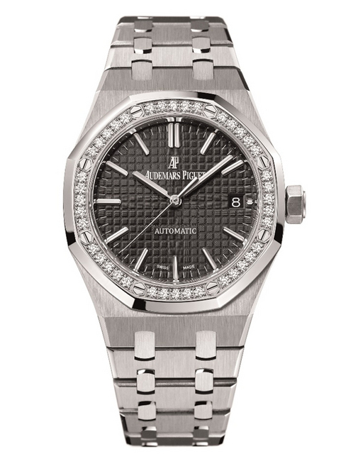 爱彼皇家橡树系列女装自动上鍊手表表壳直径37毫米,将典雅气质与纤巧表型完美结合。手表的缎面打光和拋光纹饰交替出现,呈现迷人耀眼的光影效果。炉火纯青的表面加工和40颗品质无与伦比的明亮形切割美钻互相辉映时,更能彰显衬托出精湛工艺的独特价值。