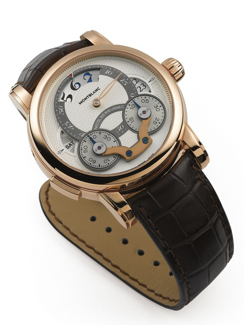 18K玫瑰金材质/MB R220自动上鍊机芯/时、分、日期、星期显示/日夜显示、计时码表功能/鱷鱼皮表带、摺叠扣/蓝宝石水晶镜面、螺丝固定式透明底盖/防水30米/参考价:NT$ 1,068,000