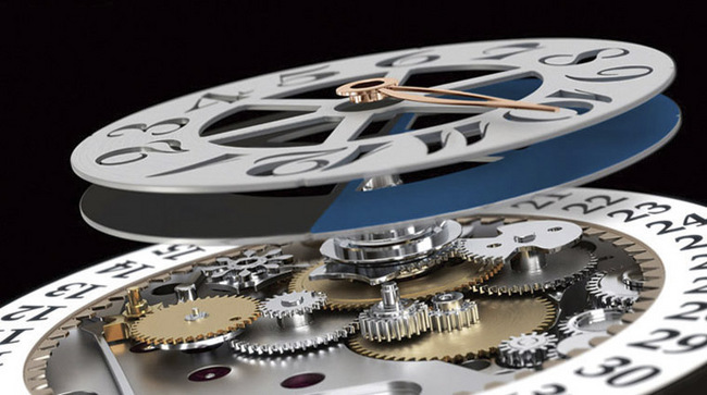 表款设计了两枚特殊的齿轮来驱动日夜盘;其实要达到类似的效果应该还有其他像换日机构之类的更古典的方式,这个新设计的优点应该是在于动力稳定,而且结构简单。