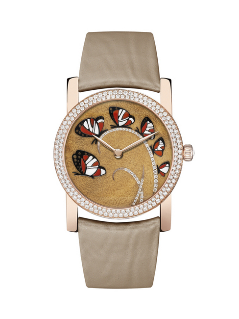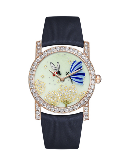 Attrape-moi… si tu m'aimes系列透过五枚珍贵手表带你走进CHAUMET的动物寓言世界。珠宝工匠以精采绝伦的艺术手法为鲜花、昆虫、蝴蝶和鸟儿筑起华丽的舞台,在一片繁茂的大自然中诉说着关于爱与诱惑的小故事。表盘配衬35毫米玫瑰金镶钻表壳。彩色丝缎或白色鱷鱼皮表带则配以玫瑰金镶钻针式表扣,与两隻表耳互相紧接 - 完美的垂直度彰显了线条设计的纯度。时针与分针则随着自动上链机芯的运转,为表盘上的蜻蜓、蝴蝶或蜜蜂注入生命力,演化成细致的动画...