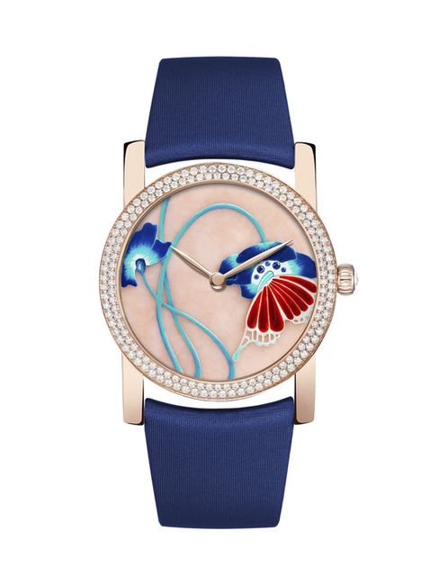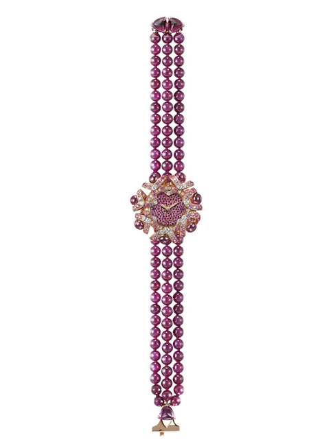 由十二片绣球花花瓣组成一朵盛开的花。有些面向着中心,由红宝石、粉红色蓝宝石和钻石塑造出渐变色彩。其他花瓣饰有一颗水滴形的红碧璽,构成了一顶华丽的花冠。表盘的心臟地带以玫瑰金镶嵌红宝石,同样以玫瑰金制成的时针和分针运行其上。这绣球花坐落于由叁排红宝石珠粒和叁颗红碧璽凸面圆形宝石组成的表带之上。