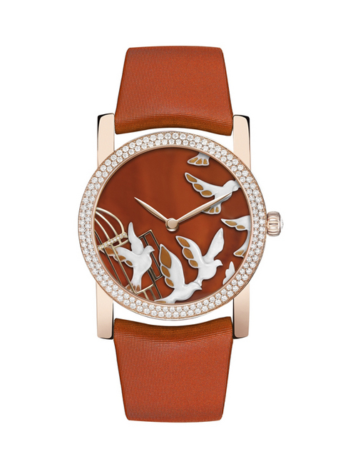 一群鸽子从镶钻的黄金鸟笼中逃脱,在一片橙色宝石的晴空中自由翱翔。採用浮雕技术雕琢而成的鸟儿,透过纯白色的雕刻玛瑙与镶嵌上大明火珐琅凸面圆形图案的翅膀尖端,在表盘上脱颖而出。