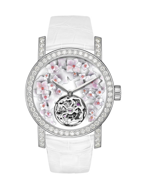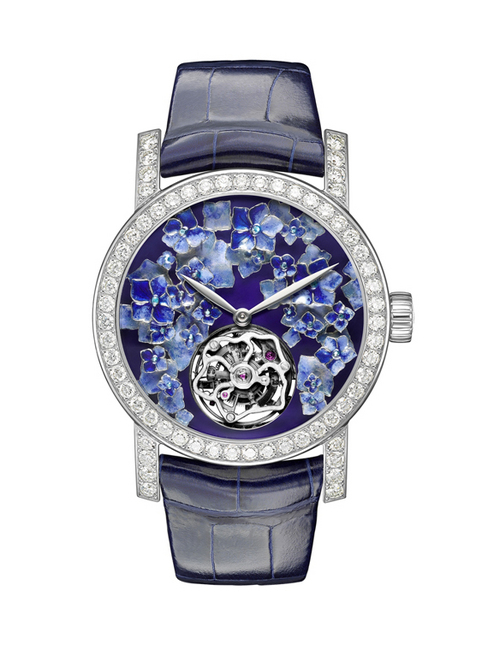 此系列的镶钻白金手表表盘展示了陀飞轮的机械装置。陀飞轮设于6时位置,并以大明火珐琅艺术为背景及绣球花的花冠作点缀;每朵绣球花均经过雕琢和手工雕刻,花蕊饰有银色铝箔珐琅。表底是一块蓝宝石玻璃,让人观赏内置的CP12V-X手动上链机械机芯 – 上盘及主机板上的绣球花设计。鱷鱼皮表带与针式表扣也饰以白金和镶钻的绣球花,为这些精致的手表作品添上完美的句点。