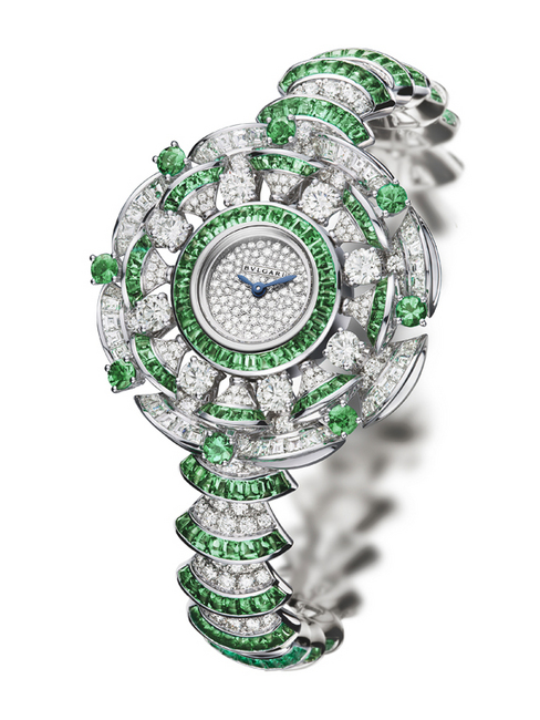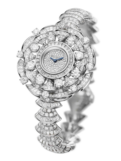 在大小适中的手表上,302 颗长形切割、16 颗圆形切割、394 颗明亮切割的钻石(总重 22.62 克拉)组成一幅高华瑰丽的画面,丰美而优雅的叶瓣,在各处细节上开展。小小的 扇形转为东方风情精致秀丽的「花束」。同时,单一或双锥状的主题图案衬托着表带。表带纤细而优雅,形成轻盈而微妙的效果,衬出雪白表盘的轻柔感。Diva 是珠宝工艺的巨匠之作, 它繁若天星的钻石有如证言,为过去六十年来当代巨星与 BVLGARI 难捨难分的情谊存证。