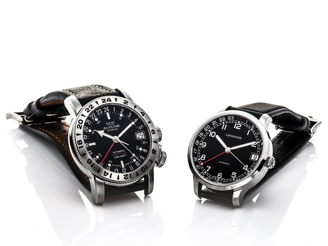 ▲ 左为 GLYCINE Airman 17,右为 LONGINES Heritage Military 1938 24 Hours