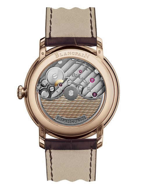 沉浸在 Villeret 系列的设计美学裡,搭配着叠层双环的红金表壳与微微鏤空的鼠尾草型时/分指针,此款新手表无庸置疑地散发着浑然天成的优雅。叁点鐘位置开啟了显而易见的日期视窗,与拥有 JB 标誌的中央秒针,更在优雅中带来一丝活泼的气息。以蓝宝石水晶制成的后底盖,更让人可清楚地一窥如在机芯桥版上的日内瓦波纹与自动盘上的蜂巢刻纹,各式精细雕琢的机芯装饰在在显示出 BLANCPAIN 的细腻工艺。