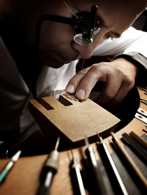 鐫刻和鏤空工艺大师专注迎接一项全新的技术与工艺挑战。鐫刻大师Dominique Vuez解释道:「要在不影响机芯品质的同时,尽可能剔除其『多餘部分』,这确实需要高超的工艺。」鐫刻大师们自有其窍诀。「对顾客而言,能看到愈多的细节固然愈理想。然而,我们为机械机芯进行鏤空加工之时,必须确保其坚固性和可靠性不受影响。」鐫刻大师首先向积家876型机械机芯的设计人员索取相关文件,随后判断可在那些零件上钻孔,以及零件上的那些部份可被剔除。在复杂功能手表工作坊裡的制表大师们协助下,他在草图和设计图上对每个微小细节进行反復推敲。当然,他还具有累积多年的丰富经验,以及承袭了表厂前辈的传统,使用相近的工艺以完成各种错综复杂的鏤空处理。