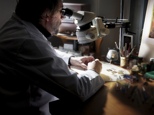 下一步是对装饰表盘及表背的白金环圈进行加工。这些精巧的零件,首先进行仔细的手工凿刻,随后採用大明火「内填」珐琅工艺进行装饰。珐琅大师Miklos Merczel 及其团队使用非常纤细的画笔,将珐琅顏料涂在零件表面。随后将零件放入窑炉内反復焙烧,直至呈现出所需的蓝色。每次在窑炉中焙烧的温度均在摄氏800至820度之间,过高的温度有可能导致裂痕或杂质出现,损坏作品。然后,零件以钻石粉末仔细打磨。珐琅工艺需要工匠极为耐心细致,而制表厂经验最为丰富的珐琅工匠,也需要耗费两天的时间才能制作出分别环绕表盘和机芯的珐琅环圈。