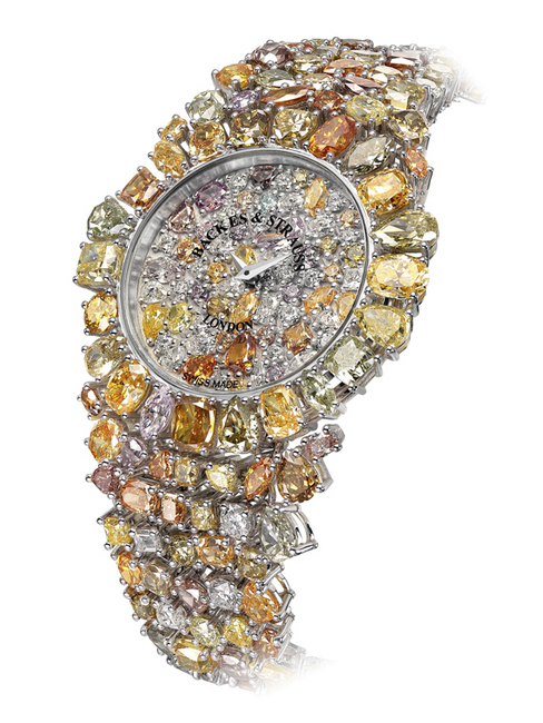 一切从简单的一个18K白金表壳开始,这款手表由人手镶嵌上不少于66种色彩的「皇家色彩」钻石,表盘、表壳和表鍊运用了10种不同切割方法的钻石。集合多种不同切割法(长阶梯形、枕形、马眼形、椭圆形、梨形、公主形、方形、祖母绿形、心形、圆形明亮式),手表犹如钻石漂亮的偶遇,不经意又相称地洒落在手表上。