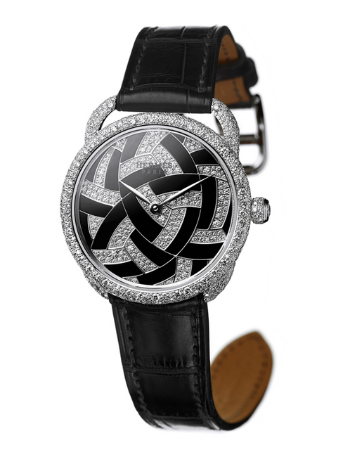 这些祖传的毛鞠工艺,啟发爱马仕方形丝布的创作灵感,其中一款图案现被Arceau手表系列重新演绎。手表以白金制造,限量发行,钻石根据雪花镶嵌方式密镶,表盘将钻石结合白色珍珠贝母、玛瑙、青金石或蛋白石,以细工镶嵌工艺重现其中一款毛球图案。
