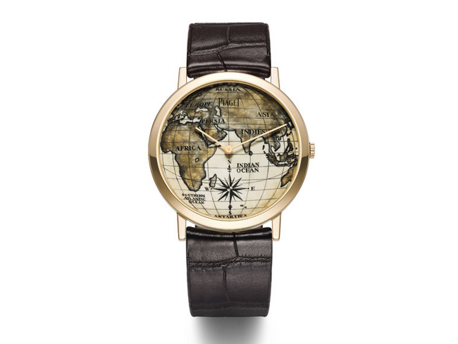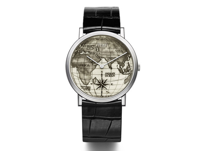 PIAGET伯爵特别邀请业界最享负盛名的巧手工匠,为面盘添上瑰丽雕刻,名副其实的贝雕大师Richard Maier活用深厚的绘画及雕刻知识,为PIAGET伯爵创制令人惊叹的「世界地图」面盘,从古代地图擷取灵感,再次带领我们环游世界,雕刻师在面盘表面塑造出拱形效果,海洋与大陆在球面渐次成形,再以微细圆点连成虚线,或是紧密堆积,缔造坑纹及浮雕效果。迷人的世界地图上巧夺天工的细节极度细致,只有在放大镜下才能仔细欣赏。过程中,工匠不时以钻石銼打磨凿针及微型雕刻刀,以确保线条准确精微。完成面盘雕刻后,雕刻师以油墨赋予图案生命,突显精致细节,并加强对比。黑色油墨渗透刻纹底部,深化面盘上的细致笔触,微妙的光影效果为未着墨的刻点带来柔美哑光,令地图犹如绘画在羊皮纸上。Altiplano 38毫米手表採用玫瑰金或白金表壳,面盘饰有世界地图,绝对会成为鑑赏家及非凡珍品手表收藏家的心头好。