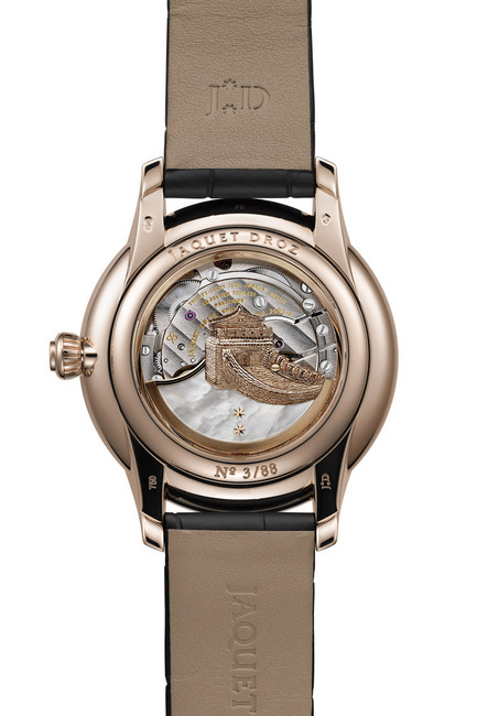 表,无论是微绘出扬蹄飞奔的两匹纯种阿拉伯骏马、还是在黑色珐琅面盘以玫瑰金半浮雕刻出的美国西北野马,或在珍珠母贝面盘上以人手雕刻出飞越中国长城的18K玫瑰金立体骏马,都让人见识到雅克德罗出类拔萃的精湛工艺。