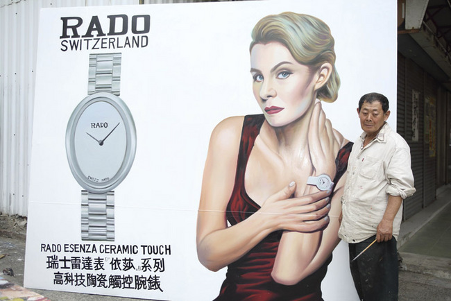 ▲ 顏师傅全神贯注的描绘RADO巨幅广告,海报人物惟妙惟肖。