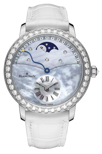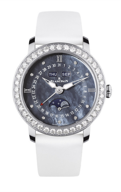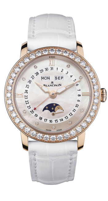 BLANCPAIN宝铂女装全歷月相限量手表,在珍珠母贝打造的面盘上,那张面带笑意睡去的「月脸」,叫人感怀。镶嵌在表圈及面盘上、总重近2克拉的58颗钻石所绽放的光芒,如同母性光辉一般耀眼。她深切的关怀,凝结在红色的日期指针上,不急不缓,从不错过地扫过每个日子。透过钢质表壳的蓝宝石水晶底盖,可以看到自动上鍊机芯Cal. 6763驱动着的全日历和月相显示、6点鐘位置的小秒针、以及12点鐘位置的星期和月份显示。此款强大的机芯提供100小时动力储存,同时配有雕刻3个心形装饰的摆陀——不停运转的能量,如母爱般持久永恆。