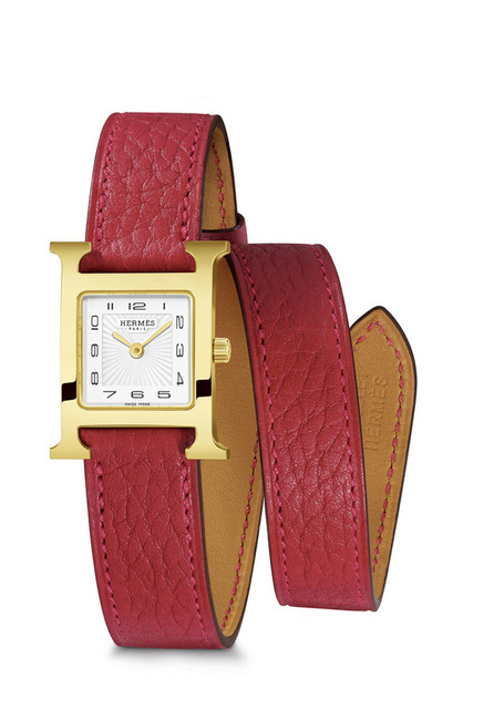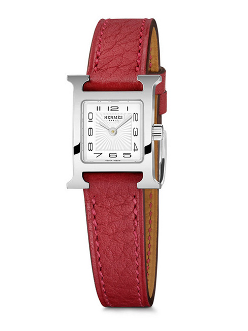 「H」是HERMÈS的品牌象徵,故此,每一枚手表都以这个标誌性的字母作为装饰,并且配上一条单环或双环的Rouge Casaque小牛皮表带。美轮美奐的手表带在位于瑞士的La Montre HERMÈS 皮革工作坊中打造,尽显HERMÈS在皮革制作方面既专业又纯熟的高水平。方便而精巧的可更换式手表带设计,让佩戴者可根据不同装扮、不同场合的需要而换上合适的表带。以方形的不锈钢作为边框,镀金或镀银的设计新颖高雅,而白色面盘上则有着仿如阳光照射般的纹理作为装饰;而另一款设计则在珍珠白的面盘上镶嵌了11颗美钻(0.09ct),散发出低调而高雅的气质。