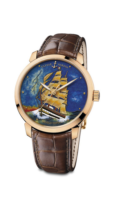 ULYSSE NARDIN为鎏金珐琅彩绘手表系列推出「亚美瑞格韦斯普奇号」。ULYSSE NARDIN向来擅长以珐琅手表纪念着名的探险船、战舰及地标,透过全新手表向最受意大利人尊敬的全装备护卫舰致敬。 建于1930年的「亚美瑞格韦斯普奇号」,其名字源自探险家亚美瑞格韦斯普奇。于 1931年啟航,曾远 航世界各地,在意国深受国民爱戴,是现役意大利海军训练船。「亚美瑞格韦斯普奇号」充分展示出优 雅,孕育着荣誉和力量,是一艘值得欣赏与敬佩的船舰。只有透过珐琅工艺 ——一门由ULYSSE NARDIN驾驭的失传艺术,才能够将「亚美瑞格韦斯普奇号」的宏伟辉煌细致刻画出来。此微型复制品犹如真实船舰般栩栩如生,表盘上发光的色彩和3D叁维效果为手表添上一份真实质感。