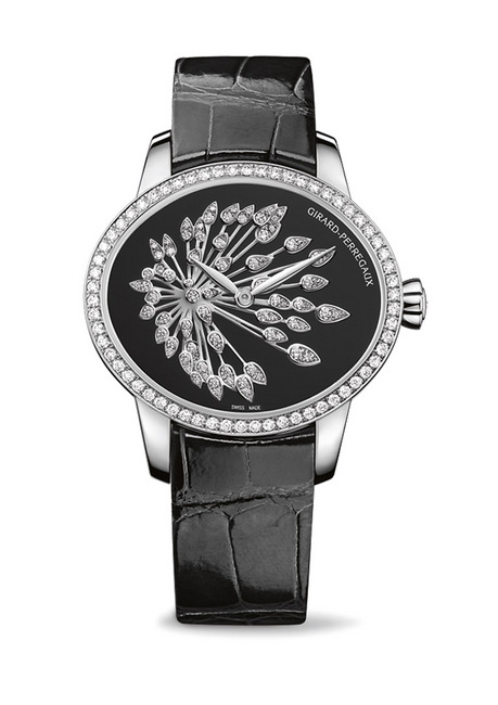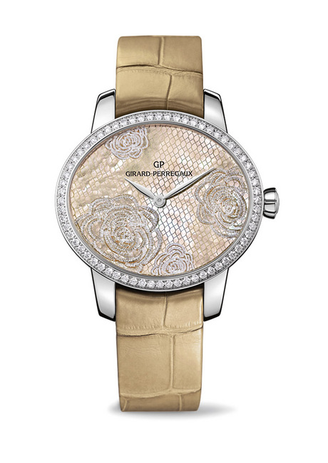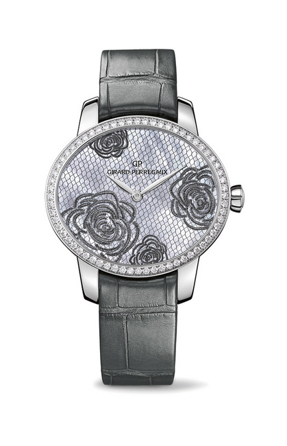如今,花中之王牡丹的美态于Cat’s Eye Bloom手表盛放:人手打磨的米黄或米白色珍珠贝母面盘覆一层鱼网状背景,再覆上牡丹蕾丝,华美又精致;GP芝柏表特别採用一种着名的鉤织技术,牡丹线条轮廓由七层纱线构成,造出立体质感;当中最后两层纱线涂金粉或银粉,造出闪亮效果,可堪与立体画媲美,尽见芝柏表独有的创新精神。光亮不锈钢表壳的表圈镶64颗闪烁圆钻,并镶密防眩水晶玻璃表镜,从透明表背可一睹GP芝柏表自家研制GP03300自动上鍊机芯的结构、钢质摆鉈GP标誌纹理雕工、夹板与底板的精美打磨修饰一览无遗;机芯可以显示小时及分鐘,动力储备约46小时。