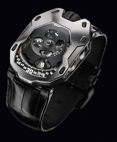UR-105M集URWERK的招牌时计技术及设计风格于一身,包括沿着0至60分鐘刻度轨跡缓缓滑行的卫星小时转头、12时位置黑色特大表冠、还有浓烈的高科技气质。鈦金属表壳嵌上如无敌铁甲的钢表圈;表盘上的聚醚醚酮(PolyEtherEthercetone)罩篷盖着四个由日内瓦十字轮推动的锻造铝合金卫星小时转头,转头沿60分鐘刻度推进,罩篷开口位置可见当下的小时位数;转头走完60分鐘后便转位数,并要继续滑行3小时后才会再次露面;连同嵌于表环的秒鐘及动力储备显示,组成立体的时分秒显示模式。表背是URWERK最有代表性的控制板设计,当中「抹油指示器」(Oil Change)可以提醒表主维修保养年期,另设42小时动力储备显示以及调节走时精确度的微调螺丝。