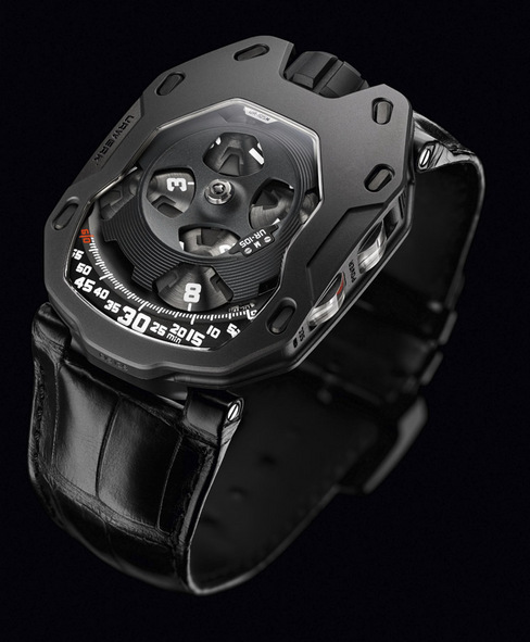 ▲ UR-105M Dark Knight 是以及鈦金属壳配AlTiN涂层钢表圈,全黑造型展现神祕男人味。