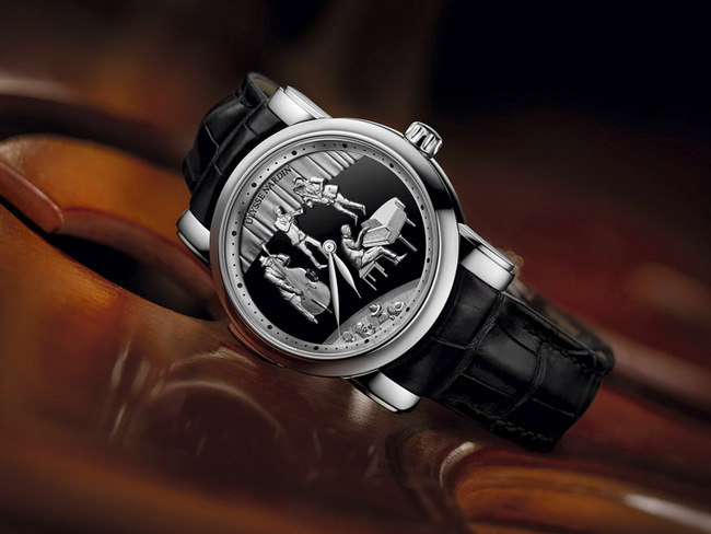 ▲墨黑縞玛瑙的42mm面盘上镶饰着18K金打造的音乐家人偶,细腻巧思引人入胜。