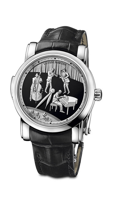 墨黑縞玛瑙的42mm面盘上四位18K金打造的音乐家人偶们关节灵动,随着叁问报时功能啟动,钢琴师率先敲动琴键开展乐曲序章,九点位置的低音提琴手负责报小时,12点鐘位置的小号与萨克斯风手则交织出刻,最后由萨克斯风手独奏出分鐘,报时完毕后钢琴手会扬起双手、完整乐章,过程流畅有趣。直至今日,在手表制作技术中使用手工雕琢活动人偶,极为罕见,拥有艺术品般的收藏地位;然而,雅典表仍然是世界上少数持续推出使用活动人偶制作叁问报时表的制表品牌。
